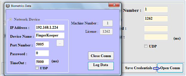 - Click on Open Comm button to set communication between the Biometric Device and Paywings.