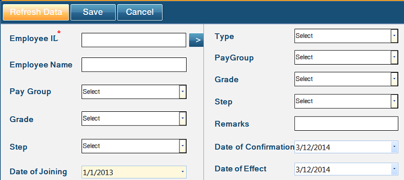 If the searched Employee ID is valid Employee Name, Pay Group, Grade, Step, Date of Joining, Date of Confirmation, Date of Effect will be automatically generated.