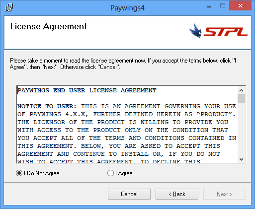 - User should choose I Agree to accept EULA (End User License Agreement) dialogue box and click Next Button to proceed.