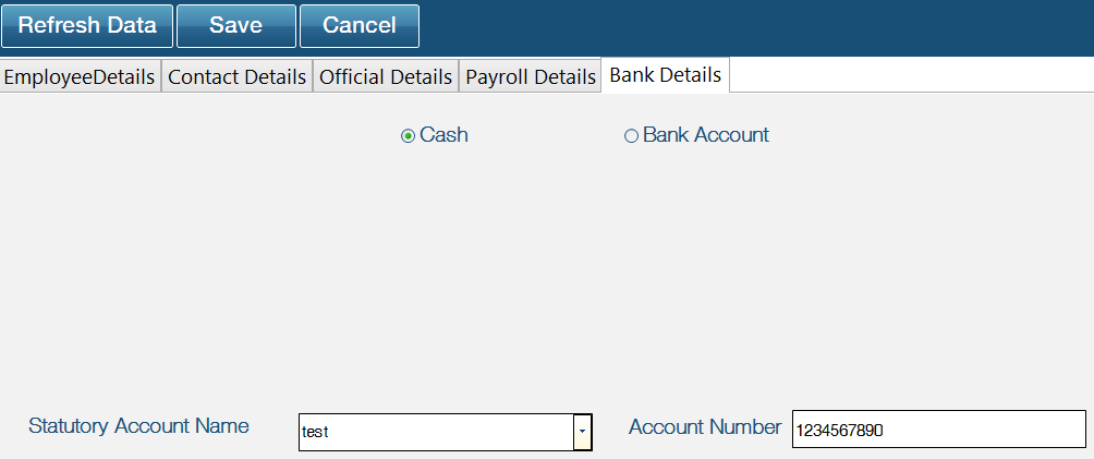 3. User can Select Account Type, Bank, Bank Branch, Account Number, Statutory Account Name, Account Number