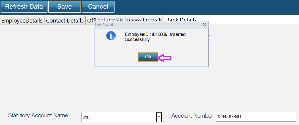 - A Message pops "Inserted Successfully" Click on OK to Save